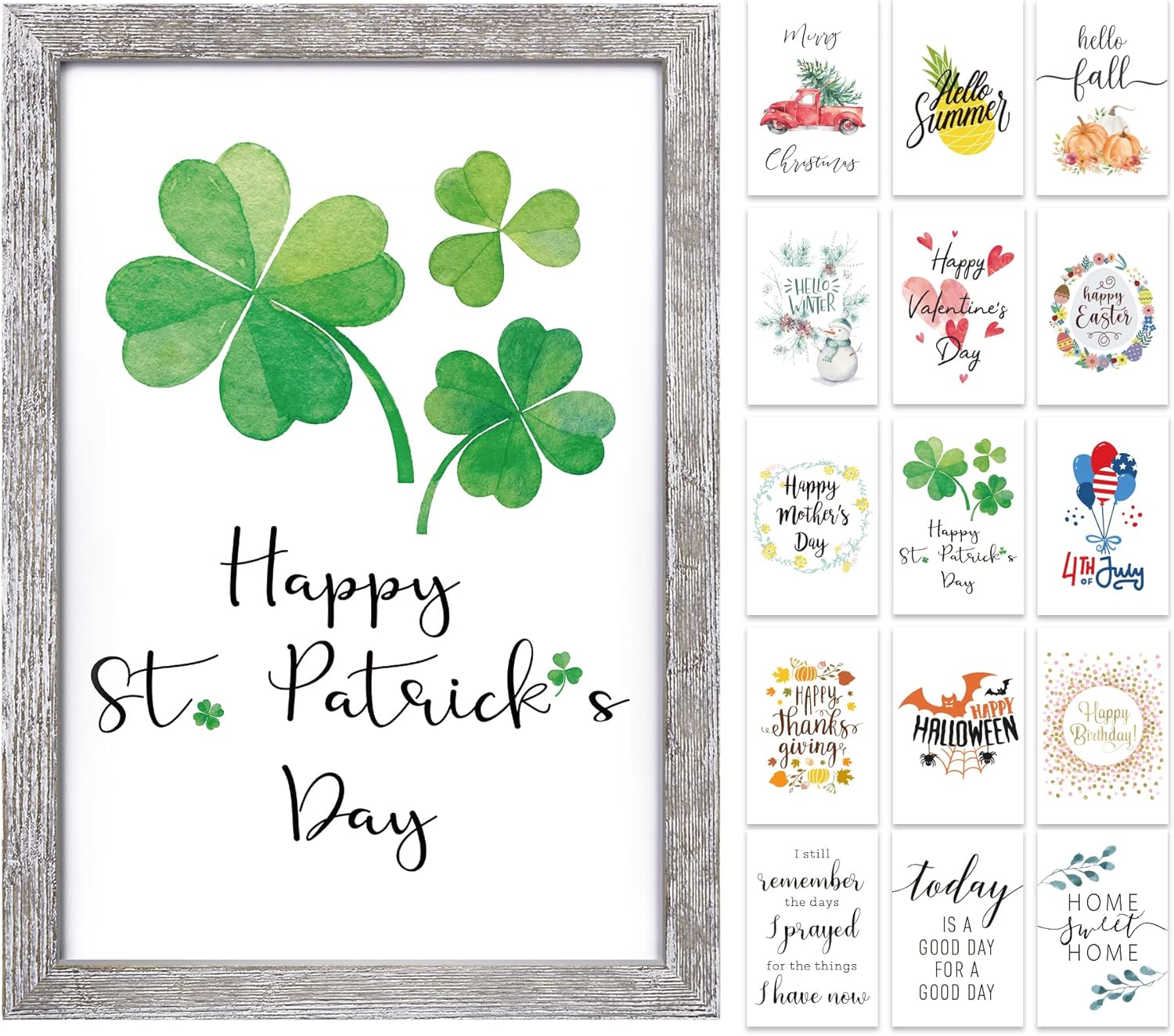 - UNIQUE & EXQUISITE DESIGNS: Each rustic wooden frame for wall art is exclusively designed with 16 unique seasonal sayings (8 double-sides printing cards) with vivid & attractive color and patterns that allow you freely switch all years around, suitable for Spring, Summer, Fall, Winter, Valentine’s Day, Easter, St. Patrick’s Day, National Day, Halloween, Thanksgiving, Christmas…The holiday sign for modern fall decor will bring on the seasonal vibes & Impress your guests, friends and family